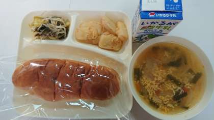 本日の献立は、いかてんぷら、チンゲン菜ともやしのピリ辛あえ、トマトと卵の中華スープ、おさつパン、牛乳です。