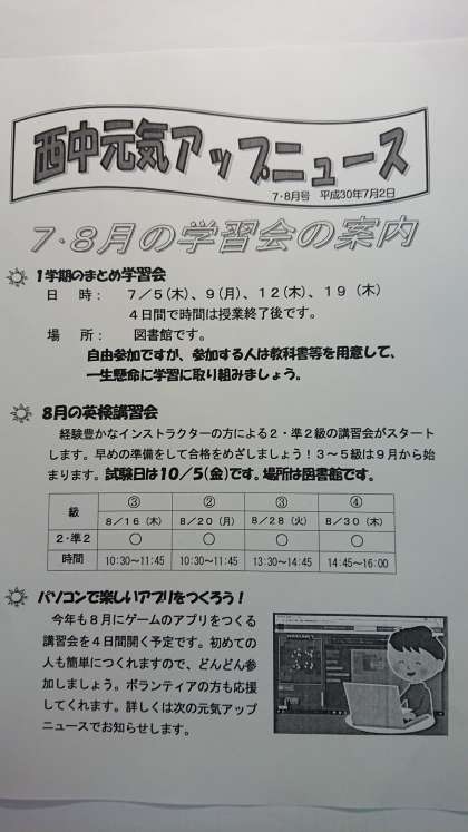 放課後学習会、英検講習会、プログラミング講習会とも、ぜひ参加してください。