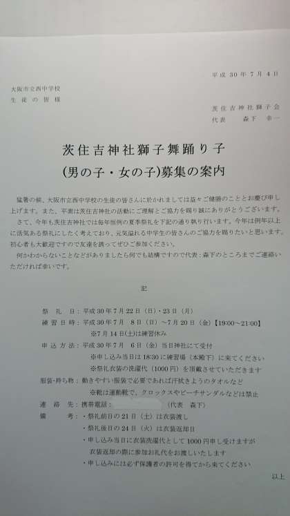 7月22日(日)23日(月)に行われる「茨住吉神社夏期祭礼」の獅子舞踊り子募集の案内を、地域の依頼により配付していますので、ご覧ください。