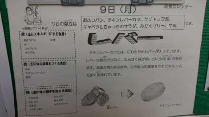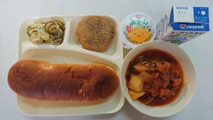 本日の献立は、チキンレバーカツ、ケチャップ煮、キャベツときゅうりのサラダ、おさつパン、みかんゼリー、牛乳です。
