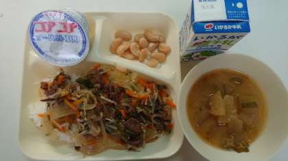 本日の献立は、牛丼、大福豆の煮もの、冬瓜の味噌汁、ヨーグルト、牛乳です。