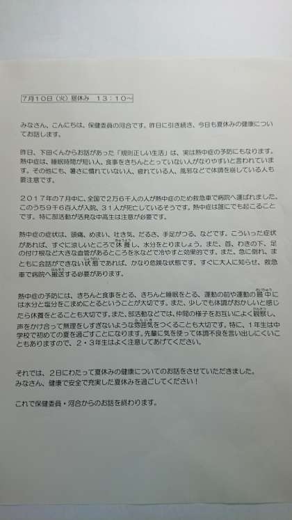 昨日の3年生下田くんにつづいて、今日は2年生保健委員の河合くんが「夏休みの健康」について放送で話をしました。