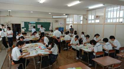 写真は、本日1時限目の、1年生1組の美術の研究授業の様子です。