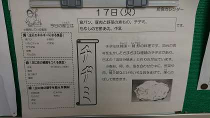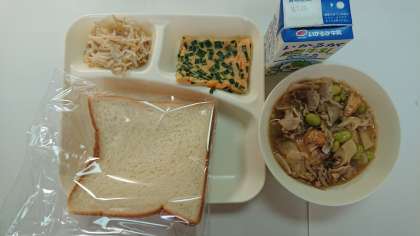 本日の献立は、豚肉と野菜の煮物、チヂミ、もやしの甘酢あえ、食パン、牛乳です。