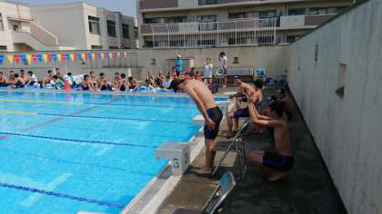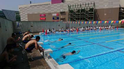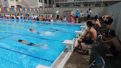 25メートル平泳ぎ、25メートルビート板、25メートル背泳ぎ、25メートル自由形と競技が進んでいます。