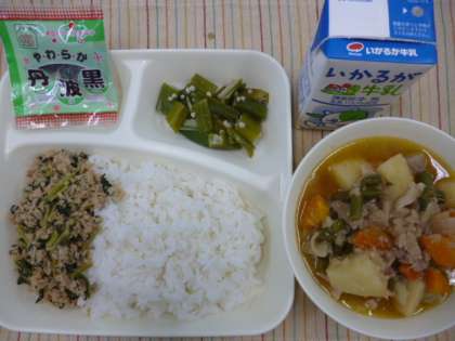 本日の献立は、豚肉とじゃがいもの煮物、オクラの梅風味、ツナっ葉いため、ソフト黒豆、ごはん、牛乳です。