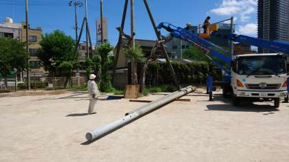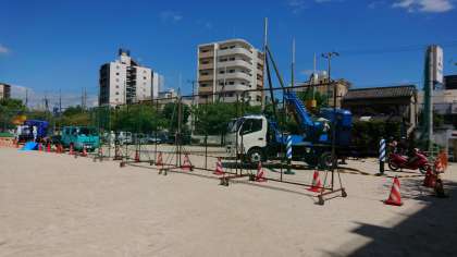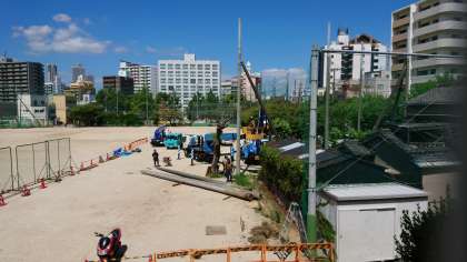 夏季休業中に、本校運動場北側の防球ネット改修工事を行っています。