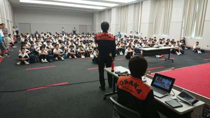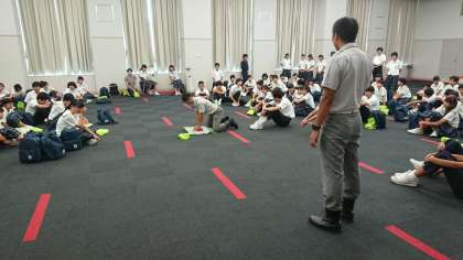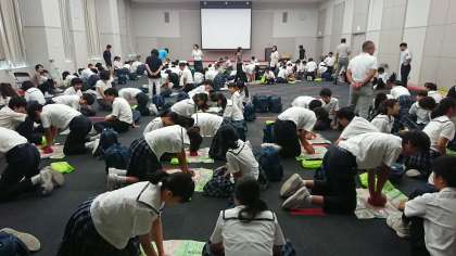 そのあと2,3年生は、そのまま大阪市消防局7階講堂において「胸部圧迫(心臓マッサージ)」の講習を受けました。