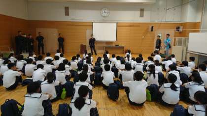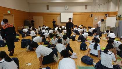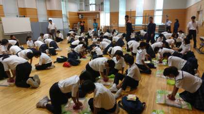 1年生は、隣接する西消防署2階講堂において、「胸部圧迫(心臓マッサージ)」の講習を受けました。