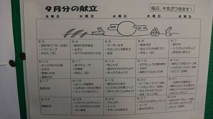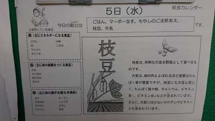 本日の献立は、マーボー茄子、もやしの胡麻酢あえ、枝豆、ごはん、牛乳です。
