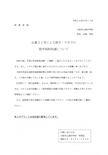 本日、生徒様を通じて保護者様宛に「台風21号による被災・り災での就学援助申請について」の文書を配付しましたので、ご確認いただきますようお願いいたします。