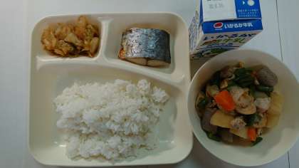 本日の献立は、さごしの塩焼き、キャベツのおひたし、じゃがいもと一口がんもの煮物、ごはん、牛乳です。