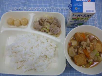 鶏肉とさといもの煮物、、豚肉とキャベツのいためもの、みたらしだんご、ごはん、牛乳です。