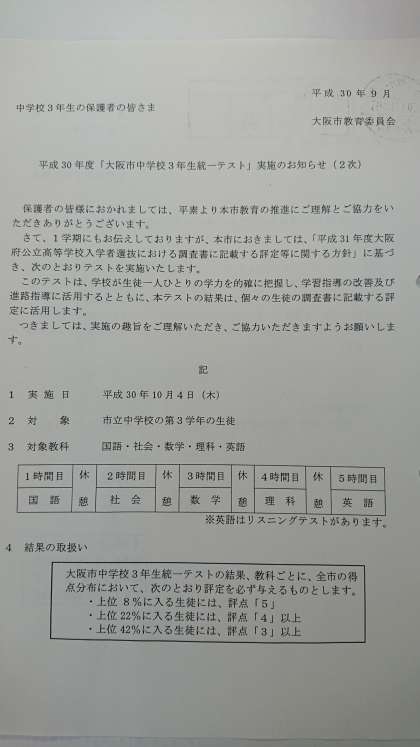 明日は「大阪市中学校3年生統一テスト」です。