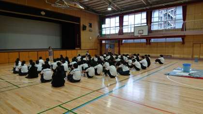 かわって、いつも通り2年生学年集会を体育館で行いました。(雨が降ると体育館が雨漏りします。)
