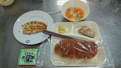 本日の献立は、鶏肉の香草焼き、サワーキャベツ、スープ煮、ソフト黒豆、ライ麦パン、牛乳です。