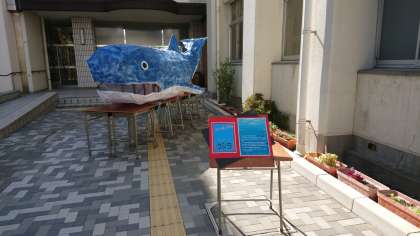 正門を入って、まず目に入るのが、3年生の巨大展示、立体模型の「クジラ」です。