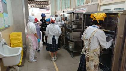 下の写真は、1年生の配膳室前の様子です。「お腹すいた」「美味しそう」の声が聞こえてきます。