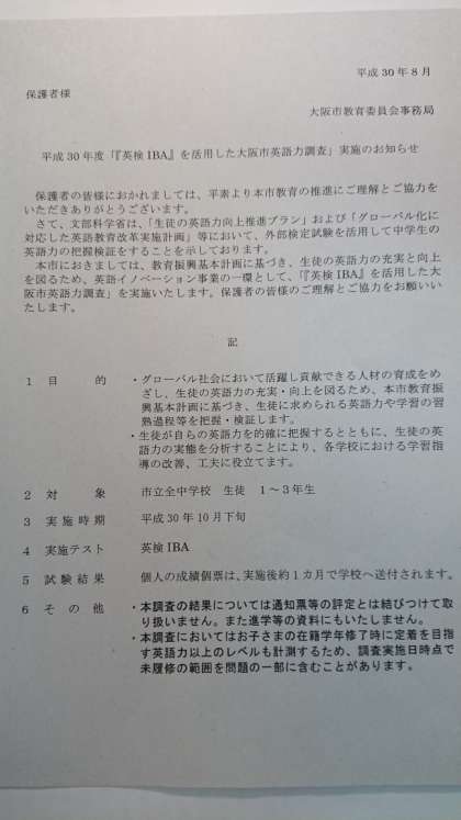 昨日1,3年生、本日2年生が、「英検IBA」を活用した大阪市英語力調査を受検しました。