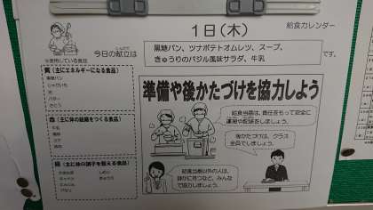 本日の献立は、ツナポテトオムレツ、きゅうりのバジル風味サラダ、スープ、黒糖パン、牛乳です。