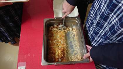 ツナポテトオムレツを、上手に切り口を入れて、均等に分けていきます。
