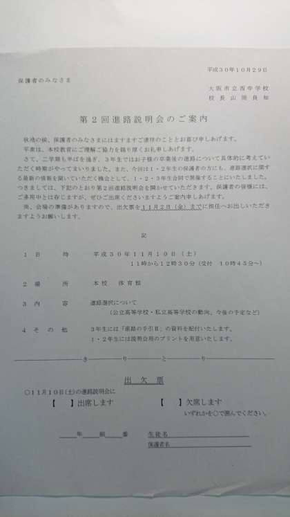 明日「土曜参観」後、体育館において「第2回進路説明会」を行います。