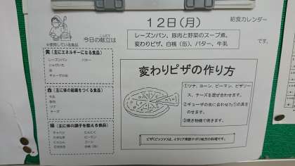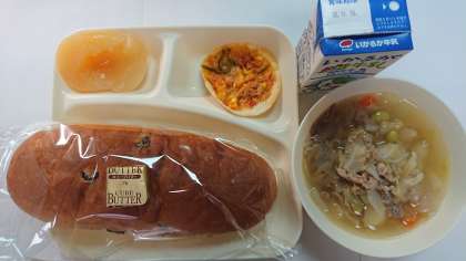 本日の献立は、変わりピザ、豚肉と野菜のスープ煮、白桃(缶)、レーズンパン、バター、牛乳です。