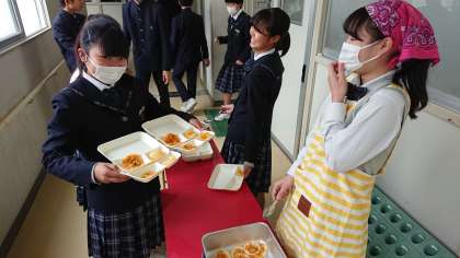3年3組では、配膳時間短縮のため、両手に4皿持って配膳してくれている生徒がいました。