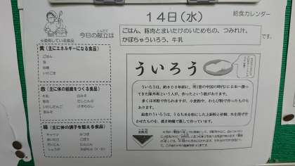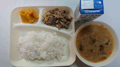 本日の献立は、豚肉と舞茸の炒め物、つみれ汁、かぼちゃういろう、ごはん、牛乳です。