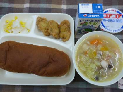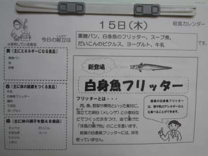 本日の献立は、白身魚のフリッター、スープ煮、大根のピクルス、ヨーグルト、黒糖パン、牛乳です。