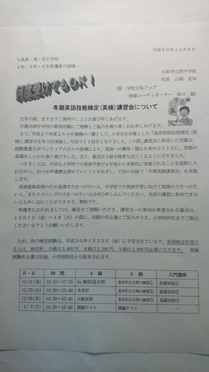 校区小学校4,5,6年生の皆さんに、「冬期英検講習会」の案内を配付しています。