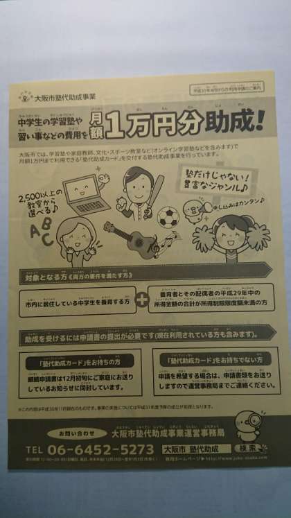 「大阪市塾代助成事業」のご案内を配付しています。