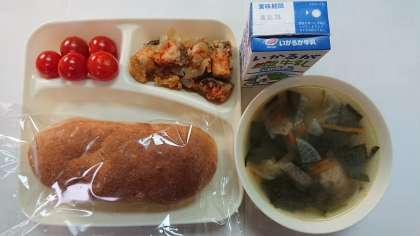 本日の献立は、鮭のマリネ、肉団子と麦のスープ、プチトマト、ライ麦パン、牛乳です。