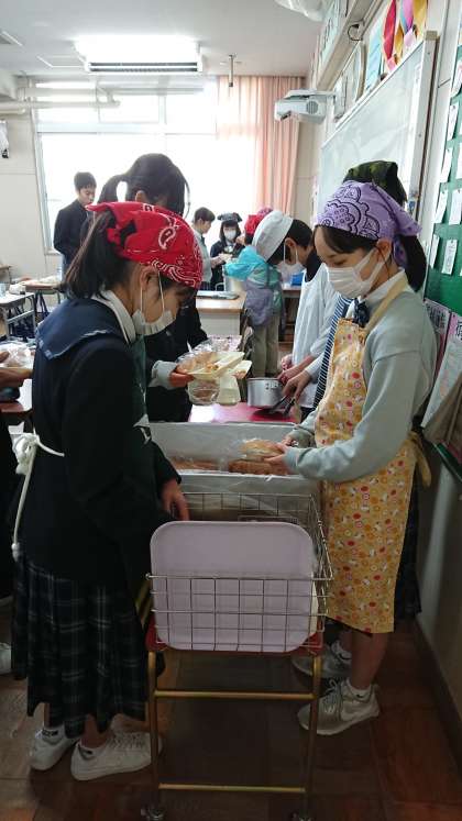 2年生は、教室内で給食の配膳をしていて、みんなで協力してテキパキとしています。
