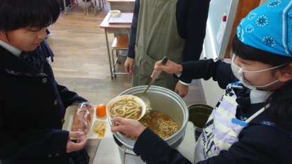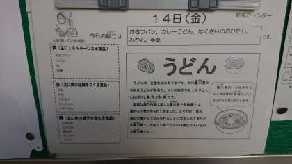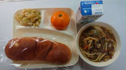 本日の献立は、カレーうどん、白菜のおひたし、みかん、おさつパン、牛乳です。