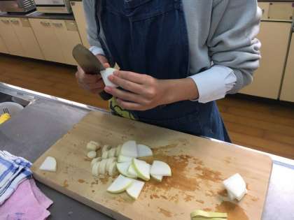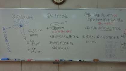 技術科で収穫した「大根」を、家庭科の調理室に持ち込み、調理実習で使います。