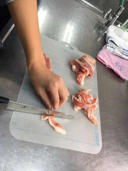 まず、大根と豚ばら肉を切ります。