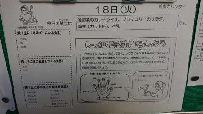 本日の献立は、冬野菜のカレーライス、ブロッコリーのサラダ、黄桃(カット缶)、牛乳です。