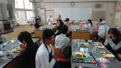 1年1組は、調理室で「豚バラ大根」とともに給食をいただきます。