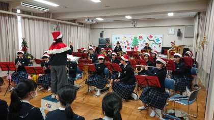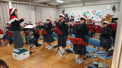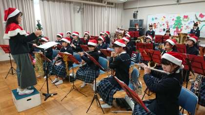 多目的室をクリスマス飾りでいっぱいにし、サンタの帽子、トナカイのカチューシャをつけての演奏です。