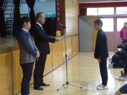 このあと、年末に行われた、野球部「駅伝大会」の表彰状の伝達を行います。