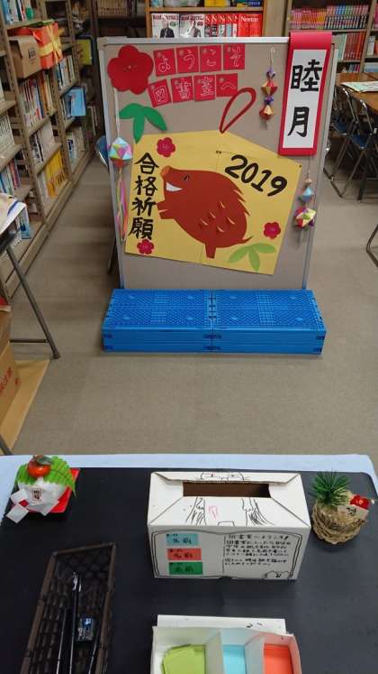 図書館入口も、お正月バージョンに飾り付けてくださいました。