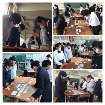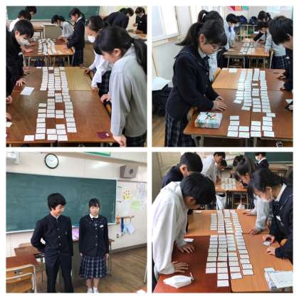 学級代表から百人一首のルール説明を受けて、いざ、勝負!
