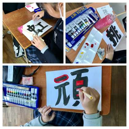 文字は全員、筆で書きます。その後絵の具などでデコっている人もいました。