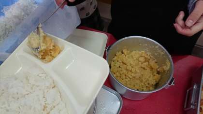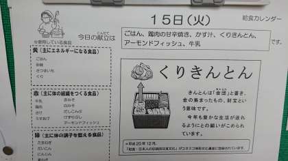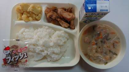 本日の献立は、鶏肉の甘辛焼き、かす汁、栗きんとん、ごはん、牛乳、アーモンドフィッシュです。