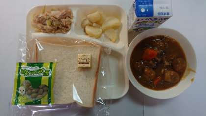 本日の献立は、ミートボールと野菜のカレー煮、ツナとキャベツのソテー、焼きじゃが、食パン、マーガリン、抹茶大豆、牛乳です。