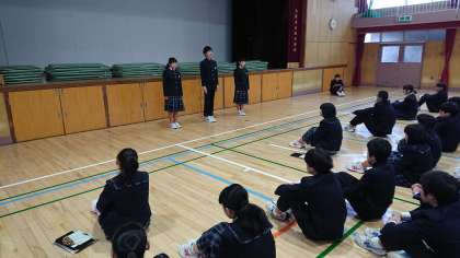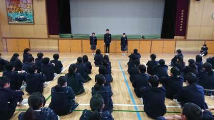 昨日の1年生学年集会につづいて、生徒会役員のみなさんが、「3年生を送る会」の合唱団員募集の告知をしてくれました。