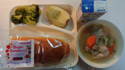 本日の献立は、鶏肉と野菜の洋風煮、ブロッコリーのサラダ、りんご、コッペパン、いちごジャム、牛乳です。
