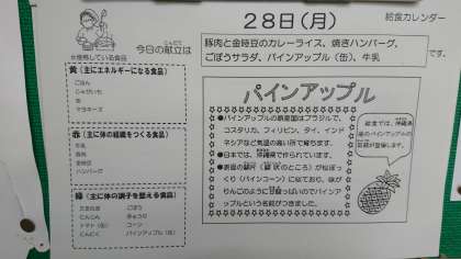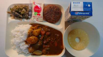 本日の献立は、豚肉と金時豆のカレーライス、焼きハンバーグ、ごぼうサラダ、パインアップル(缶)、牛乳です。