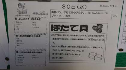 本日の献立は、帆立貝のグラタン、大根のスープ、プチトマト、黒糖パン、牛乳です。
